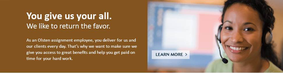 Olsten is a supplier of workforce solutions with over 60 years of experience. We specialize in the placement of highly-qualified assignment employees in temporary, temp-to-hire and permanent positions, from entry-level clerical workers to senior-level professionals. In addition to staff augmentation, we also offer end-to-end workforce-related management services for companies who are looking to save time and money.